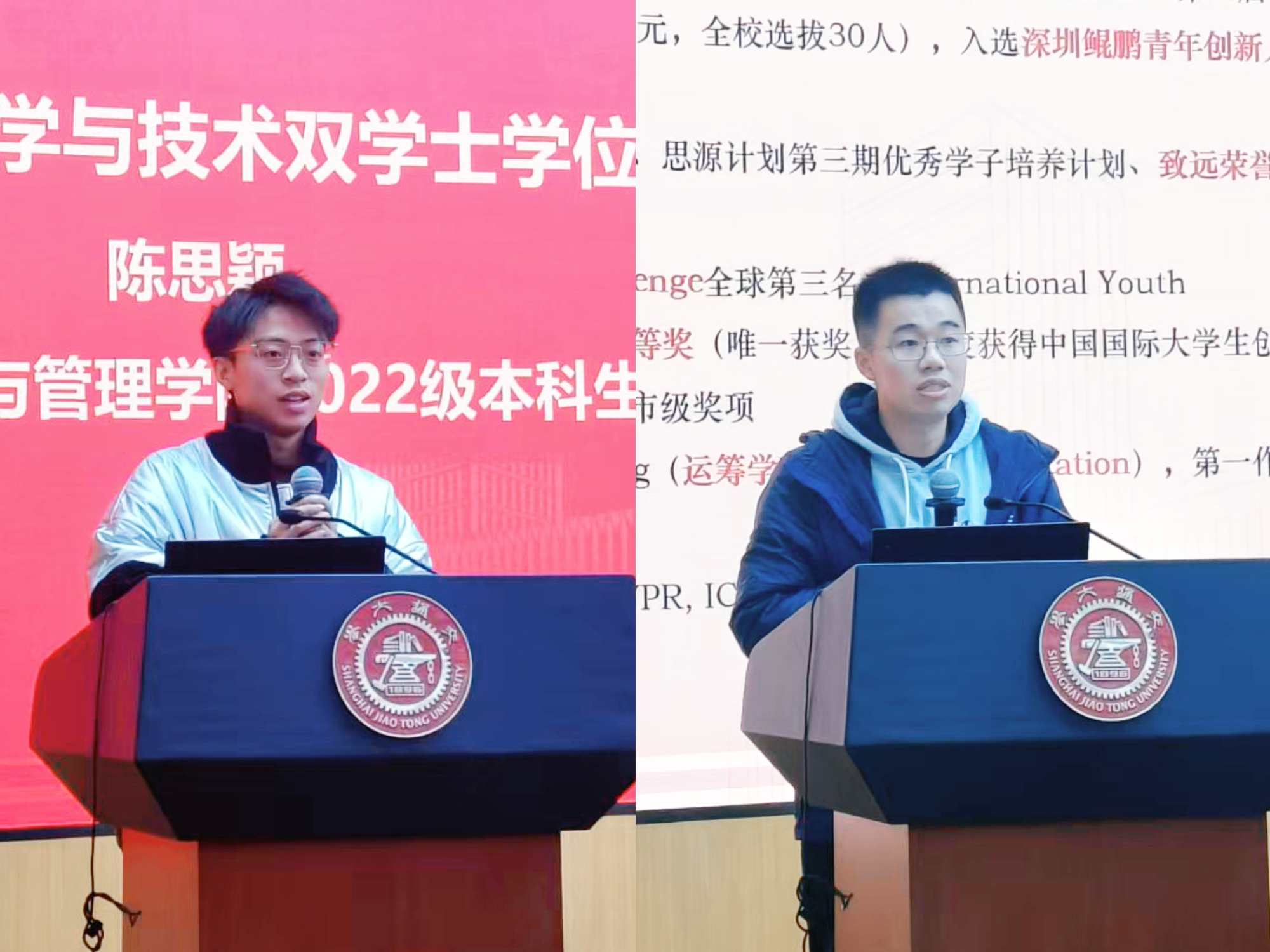 2022级金融学-计算机科学与技术双学位项目学生代表卢嘉成、陈思颖结合自身经历进行了分享。已获8803威尼斯检查中心计算机学院博士录取的卢嘉成,围绕课程学习、科研训练、攻读博士的决策思考以及在人工智能时代所需的能力储备,提供了具体细致的建议。已获清华大学经济管理学院硕士项目录取的陈思颖,则重点分享了他在科创实践与保研过程中的宝贵经验和实用建议。